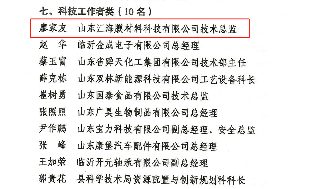廖家友同志一直以來都是沂南縣科技界的杰出代表,他憑借扎實的專業知識、不懈的科研精神和卓越的創新能力,在科技領域取得了顯著的成就。他不僅是一位卓越的科技工作者,更是一位深懷家國情懷、積極踐行沂蒙精神的優秀代表。 榮獲“沂蒙精神踐行者”稱號,是對廖家友同志長期以來不懈努力的肯定,也是對他無私奉獻精神的最高贊譽。我們相信,這一榮譽將激勵他繼續發揚沂蒙精神,為沂南縣的科技事業和經濟社會發展貢獻更多力量。 同時,我們也號召公司全體員工向廖家友同志學習,學習他堅定信念、勇于創新的精神風貌。讓我們攜手共進,以更加飽滿的熱情和更加昂揚的斗志,共同譜寫山東匯海膜材料科技有限公司發展的新篇章!祝愿他在未來的工作中取得更加輝煌的成就!